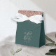 O flape da frente desta elegante e moderna caixa de favoritos de casamento apresenta uma borda falsa e falsa de ouro rosa. O texto personalizável combina a letra rosa-rosa pálida e as fontes de impressão em um grande e verde-escuro em um fundo verde-escuro.