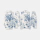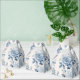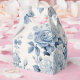 Padrão floral elegante e romântico que inclui aglomerados de rosas azuis e poeirentos claros e escuros e folhagem num fundo branco suave e antigo.