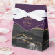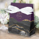 Esta elegante caixa de favores moderna apresenta uma design de agata preta, aparada com brilho dourado. Personalize-o com os nomes do casal em uma escrita manuscrita dourada sobre um grande e, junto com a data do casamento abaixo, em um fundo roxo.