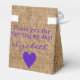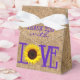 Adicione um chá de casamento moderno para seu dia especial. Esta bonito caixa de pequenos favores está em um popular país rústico, uma IMAGEM de fundo, com a palavra "AMOR" usando um girassol amarelo e texto roxo. Texto no verso "Obrigado por compartilhar meu dia!" com o nome das noivas e um coração roxo. Uma fita branca torna este elegante favor de convidado de chá de panela perfeito para um casamento de celeiro. Esta pequena caixa é do tamanho certo para um cartão-presente. Perfeito para os presentes das damas de honra. Personalize com o nome das damas de honra na parte de trás da caixa. Não se esqueça de adicionar um para sua sogra e sua mãe. Parabéns!