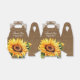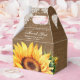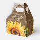 Coloque seus presentes de chá de panela/casamento nessas caixas florais românticas de favores florais com girassol em um fundo de burlap adornada com rendas florais brancas e luzes de cordas.