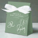 These sage green baby shower favor boxes feature elegant script lettering, a sweet heart with baby footprints, and a soft ribbon finish. Perfect for holding treats or small gifts, they add a refined, gender-neutral touch to modern baby shower décor and coordinate beautifully with minimalist celebration themes.