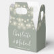 Caixa de favoritos de casamento elegante com luzes de cordas bonito, nomes de script de assinatura chic e data especial em um fundo verde sage. Você pode personalizar com seu próprio obrigado sua mensagem ao contrário. Uma maneira perfeita de dizer obrigado aos seus hóspedes! Projetado por Thisnotme©