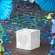 Coração branco com nomes de recém-casados em um padrão de damasco branco satinado. Os nomes e data são editáveis.