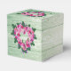 Rosas cor-de-rosa, em forma de coração, sobre uma parede de madeira pintada de verde-claro. Um design de coração bonito e casual que faz um belo tema para um chá de panela, casamento, aniversário ou festa de Dia de os namorados.