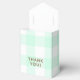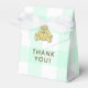Obrigado seus convidados por vir ao seu chá de fraldas com esta bonitinha caixa de favores com um doce ursinho vestindo um arco verde-menta. O fundo é um padrão de verificação de búfalos branco e verde da menta. Texto na frente diz "Obrigado!" Perfeito para chás de fraldas neutros em termos de gênero.