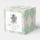 Estas bonitas caixas de presentes femininas de "Sorte Pequeno Obrigado" apresentam uma carruagem vitoriana irlandesa desenhada à mão, com um brilho e tons verdes macios, todos contra um adorável padrão de estilo rosa e verde. Personalizar com detalhes do evento. Impresso na frente e atrás. Estas caixas de presentes são da coleção de chás de fraldas "A Lucky Little Shamrock".