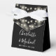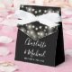 Caixa de favoritos de casamento elegante preto e branco com luzes bonito de cordas, nomes de scripts de assinatura de na moda e data especial definida na tipografia moderna. Você pode personalizar com seu próprio obrigado sua mensagem sob a tampa. Uma maneira perfeita de dizer obrigado aos seus hóspedes! Projetado por Thisnotme©