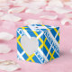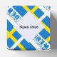 A bandeira sueca, azul com uma Cruz Nórdica amarela, e a palavra SUECIA abaixo, em azul com letras de neve. O design é marcado para efeito artístico. Uma área branca de quadrados rabugentos tem um lugar para o seu nome para um toque personalizado. Se quiser criar um presente personalizado, basta adicionar o nome de outra pessoa.
