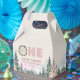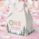 Esta caixa de favoritos apresenta montanhas de aquarela e paisagem florestal. o "um" é um círculo de madeira e xadrez rosa. É a maneira perfeita de se ir ao obrigado para a festa do seu pequenino.