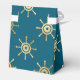Caixa de favor apresentando um padrão de roda de navio em folha dourada falsa contra um fundo azul.