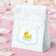 Baby blue gingham baby shower with a hand drawn bow. Water droplets frame a rubber duck surrounded by bubbles