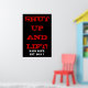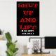 Um clássico poster de ginástica motivacional, feito em cores preto, vermelho e branco. Tem a frase SHUT UP AND LIFT escrita nela, com a frase MASS DEPT. EST. Dia 1 debaixo dele. Um poster poderoso para qualquer um que leva a sério o seu treino na academia.