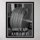 Um poster preto e branco, com cinco placas de peso no bar. Tem uma borda negra e cinza, com a frase "SHUT UP AND LIFT!" escrita nela. Um deve ter poster para qualquer um que leve seu treinamento a sério! Levantamento de peso, exercício, academia, motivação.