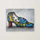 Calçado vitoriano apresenta um calçado antigo e colorido. Nas cores primárias de vermelho, amarelo e azul com pontos brancos para fundo de trim e cinza.