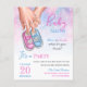 Um gênero de bebê no orçamento revela convite de festas. Em um fundo branco, duas mãos se seguram, assim como um calçado de bebê azul e rosa. O texto da tipografia lê o sobrenome do bebê seguido por Blue ou Pink, o que você acha? Personalize adicionando seu evento de cheio e os detalhes de contato.