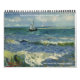 Um belo calendário de 12 meses com pinturas de arte de apos impressionismo de vintage de Vincent van Gogh. Janeiro - Noite estrelada sobre o Ródano fevereiro - Vista do Mar em Scheveningen March - Ponte Langlois em Arles com Mulheres Lavando abril - Pesca na Primavera, Pont de Clichy May - Capa de Saintes-Maries June - Pontes do Mar em Asnieres Julho - Vista de um rio com Barcos Remerentes Agosto - Banco da Oise em Auvers Setembro - Bancos O Sena de outubro - O De Ruijterkade em Amesterdã novembro - Quay with Men Unloading Sand Barges Dezembro - Barcos de Pesca na Praia em Saintes Maries Back Cobrir - Capa de Passagem em Les Saintes-Maries-de-la-Mer Vincent Willem van Gogh (1853-1890) foi um pintor poste-Impressionista neerlandês cujo trabalho, Para sua beleza áspera, honestidade emocional, e cor ousada, ele teve uma influência profunda na arte do século 20. Enquanto vivo sua obra era então conhecida por apenas um punhado de pessoas e apreciada por menos ainda. Van Gogh adorava arte desde cedo. Ele começou a desenhar quando criança, e continuou a fazer desenhos de fazer ao longo dos anos, levando à sua decisão de se tornar um artista. Ele só começou a pintar aos vinte e poucos anos, completando muitas de suas obras mais conhecidas em seus últimos dois anos. Em pouco mais de uma década produziu mais de 2 mil trabalhos de arte, constituídos por 860 pinturas a óleo e mais de 1.300 aquarelas, desenhos, esboços e impressões. Seu trabalho incluiu autorretratos, paisagens, ainda vidas de flores, retratos e pinturas de ciprestes, campos de trigo e girassóis. Em 1885, pintou seu primeiro grande trabalho Os Comedores de Batata. Sua paleta na época era composta principalmente por tons de terra sombria e não mostrava nenhum sinal da vívida coloração que distinguia seu trabalho posterior. Em março de 1886 mudou-se para Paris e descobriu os Impressionistas Franceses. Mais tarde mudou-se para o sul da França e foi tomado pela forte luz do sol que encontrou lá. Seu trabalho ficou mais brilhante em cores, e ele desenvolveu o estilo único e altamente reconhecível que se tornou totalmente realizado durante sua estada em Arles em 1888.