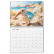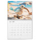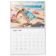 Uma ilustração esbranquiçada de uma ave empoleirada em um galho, cercada por quatro temporadas diferentes. A plumagem do pássaro passa de azuis gelados e brancos do inverno para flores vibrantes do verão, amarelos quentes do verão, e folhas do outono, mostrando a beleza cíclica das estações. O calendário é adornado com flores e folhas que combinam a cada estação, criando um senso de harmonia e equilíbrio.