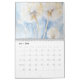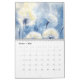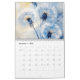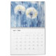 O calendário apresenta flores de dandelion em vários palcos de floração no estilo vintage/rustic. As flores são representadas em tons de azul, branco e amarelo e colocadas sobre um fundo azul macio.
