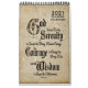 Calendário de 12 meses: O Cobrir apresenta a bem conhecida "Serenity Prayer" frequentemente associada à Recuperação. O dentro de Calendário inclui um planejador mensal (3 áreas) para suas anotações escritas ("Minha Lista de Tarefas Pendentes", "Minhas Pensamentos" e "Minhas Metas". O texto é, "Deus me conceda a serenidade para aceitar as coisas que eu não posso mudar. a coragem de mudar as coisas que posso; E a sabedoria de saber a diferença." Caligrafia preta sobre fundo castanho natural.
