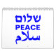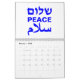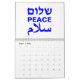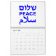 Peace Shalom Salaam — calendário tipográfico moderno branco e azul cobalto. Paz em inglês, hebraico e árabe. Texto azul cobalto sobre fundo branco.