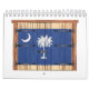 Uma grande porta dupla de celeiro de madeira fechada com pinos e dobradiças e a bandeira do Estado da Carolina do Sul pintada em