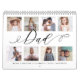Mande um belo presente personalizado para seu pai (pai) que ele vai apreciar. Calendário especial personalizado de colagem de fotos da família para mostrar suas próprias fotos e memórias da família especial. O design frontal do cobrir apresenta um simples design de grade de colagem de 8 fotos com "Pai" projetado em um belo estilo de script preto escrito à mão. Cada foto é emoldurada por um simples quadro dourado. Personalizar com os nomes dos membros da família. Todo mês apresenta uma imagem do tamanho do cheio do solteiro com o mês escrito em uma elegante caligrafia preta, mostrada levemente sobre cada foto.