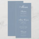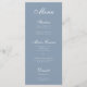 Um menu simples que tem uma cor muito moderna, "azul empoeirado", e usa uma fonte caligráfica elegante para o título e subtítulos. Todo o texto é branco.