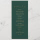 Este delicado programa de festa de casamento verde para a caligrafia do ouro é perfeito para um casamento moderno. A design romântica minimalista apresenta uma magnífica e elegante tipografia amarela ouro champanhe num fundo verde esmeralda com um aspecto simples e limpo. Inclua o nome da noiva e do noivo, a data e o local do casamento, a mensagem do obrigado, a ordem de serviço, a festa de casamento e um memorial "em memória amorosa" opcional.