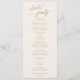 Este elegante programa de casamento de marfim de caligrafia em ouro é perfeito para um casamento simples. A design neutra apresenta uma carta minimalista decorada com a tipografia falsa de ouro romântica e caprichosa. Inclua o nome da noiva e do noivo, a data e o local do casamento, a mensagem do obrigado, a ordem do serviço, a festa noiva e um memorial "em memória amorosa" opcional. Nota: Este design não apresenta folha de ouro real. É um gráfico de alta qualidade feito para se parecer com folhas de ouro.