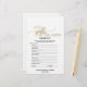 Este simples jogo de caligrafia dourada "o que está na sua bolsa" é perfeito para um chá de panela chic. A frente do cartão de jogo apresenta "como você conhece bem a noiva", e a parte de trás do cartão contém "o que há na bolsa". O clássico design romântico apresenta uma falsa tipografia de folha de ouro e um adorável coração ouro. Personalize a parte frontal da placa com o nome da noiva e a data do chá de panela. Nota: Este design não apresenta folha de ouro real. É um gráfico de alta qualidade feito para se parecer com folhas de ouro.