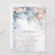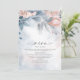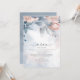 Uma fonte escrita à mão, combinada com um serif sans moderno, é usada nesta coleção de papelaria floral para estabelecer um tom quente e íntimo para o seu casamento. O menu de janto de casamento mostrado aqui mostra flores e folhagem em tons de azul empoeirado a branco-rosa suave contra um fundo de salpicos sonhosos de tinta aquosa. Adicione seus nomes, data de casamento e seleções de menu usando a modelo fornecida. Procure ID771 para ver outras peças e opções de cores para este conjunto.