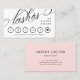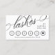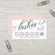 Cartão de fidelidade elegante para seu negócio de lash com lascas escritas em um roteiro suave através do cobrir. Adicione seu nome também. O cartão de fidelidade é para a sexta visita ou tratamento com desconto, com um coração negro marcando-o. Escreva o seu nome, a sua empresa e contacte as informações no verso com texto preto sobre um fundo cor-de-rosa esbranquiçado.