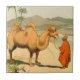 Camelo bactriano asiático que trekking no deserto aberto com uma monge que vista um vestuário e um chapéu açafrão-coloridos tradicionais. Este tipo do camelo com duas corcundas esclarece somente 10% da população de mundo, com um habitat em Ásia central.