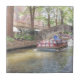 Um barco da excursão toma visitantes debaixo de uma ponte de pedra na caminhada do rio de San Antonio. Este desenho de lápis colorido digital é baseado em uma fotografia original por Jayne Wilson.
