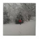 Esta azulejo mostra uma foto de uma criança caminhando através da neve fresca caída no inverno.