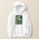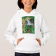Um design nebuloso caminho florestal no capuz da menina, uma floresta com flores, uma coruja e uma borboleta.