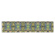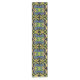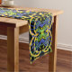 Este corredor de mesa artístico e decorativo apresenta um padrão complexo de ornamentado em tons de azul, verde, amarelo, preto e ouro. Os objetos abstrato elementares estão espalhados por todos: sóis, luas e relâmpagos. O padrão apresenta um motivo primitivo, étnico.