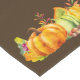 Um corredor de mesa com uma ilustração no topo e na parte inferior. Ilustração de aquarelas das abóboras e folhas sazonais de outono. Fundo castanho.