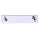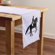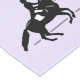 Mesa com uma ilustração a preto e branco de um cavaleiro de vestimenta em traje formal. O cavalo e o cavaleiro estão tocando uma bela pirueta. Um elegante movimento clássico de vestimenta.