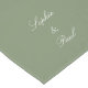 Na moda Sage Green Wedding Mesa Runner, personalize os nomes do casal, usando a modelo de personalização online antes de fazer o pedido. Os nomes do casal aparecem automaticamente em ambas as extremidades do corredor, com a inscrição correta para cima quando a queda impressa fica sobre a borda da mesa em cada extremidade.