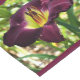 Um corredor de mesa com uma foto de uma lily roxa sobre fundo roxo