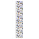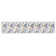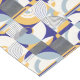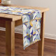 Uma sofisticada passadeira de mesa de jantar Art Déco adornada com um padrão geométrico composto por várias formas e linhas. Apresenta semi-círculos, retângulos e quadrados, cada um com diferentes combinações de cores de verão. As cores dominantes são azul, amarelo e branco. O design é simétrico, com cada metade espelhando a outra. O padrão é intrincado, com linhas formando círculos concêntricos e padrões intrincados dentro das formas.