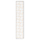 Este corredor de mesa apresenta um padrão repetitivo de quatro corações brancos ao redor de um diamante central com uma borda bronzeada sobre um fundo bege escuro.