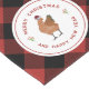 Ilustração de uma galinha vestindo um chapéu de Papai Noel cercado por "Feliz Natal e feliz ano novo" texto arquivado e bagas ocas sobre círculo branco com borda vermelha. O fundo é o padrão de xadrez de búfalo vermelho e preto.