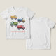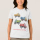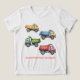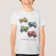 Uma ilustração decorativa do quadro de borda com quatro caminhões de despejo dispostos em um padrão quadrado. Cada caminhão tem uma cor diferente: amarelo no canto superior esquerdo, azul no canto superior direito, verde no canto inferior esquerdo e vermelho no canto inferior direito. Os caminhões são transformados num estilo simples e infantil com rodas grandes, designs básicos de cabine e corpos de lixo abertos. Os ramos de folhas verdes enquadram os cantos da imagem - dois ramos com folhas ovais grandes nos lados e um galho menor com folhas no topo. As ramificações têm uma sensação natural, orgânica, com veias e sombras visíveis. Toda a ilustração é colocada sobre um fundo branco. Os caminhões são posicionados a distâncias iguais entre si, criando uma composição equilibrada. A ilustração tem um estilo branco, infantil ou de livro infantil com linhas limpas e cores suaves.