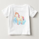 Esta camisa infantil super fofa com babado tem uma cabeça de unicórnio em aquarela dentro de uma grinalda floral na frente, com um unicórnio em tamanho real sobre nuvens nas costas. A paleta de cores é de pastéis suaves em tons de pêssego, rosa, roxo, azul e verde.