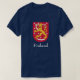 Brasão finlandesa no vermelho com a palavra Finlandia no tipo velho abaixo.