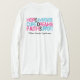 A camisa da síndrome de Ehlers-Danlos que caracteriza as palavras espera, consciência, cura, sonhos, fé, apoio no rosa, turquesa e pia batismal preta.
