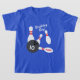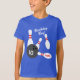 Camisa de Festa de aniversário de boliche bonita para crianças. Design de diversão para celebrar na beco da boliche. Adicione seu próprio texto personalizado para garoto ou garota. Camisetas de cor azuis ou personalizadas. Boliche de pinos de e design de golpe de bola. Vestuário personalizado para crianças.